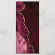 This elegant, modern wedding menu features top and bottom borders of burgundy watercolor agate trimmed with gold faux glitter. The text appears in elegant gold-coloured handwriting, italic and copperplate fonts on an emerald green background. The agate design is repeated on the reverse.