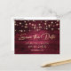 Custom burgundy rustic wood wedding save the date postcards with faux gold foil script font and featuring a rustic wood background adorned with string lights. Easily personalise this rustic save the date postcard with your wedding details. For custom requests, please send us a message.