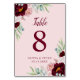Elegant, Burgundy Marsala Pink Watercolor Flowers Table Number