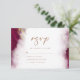 The edges of this elegant modern RSVP card features a burgundy red watercolor border design in imitation of marble veined with faux gold foil, fading gradually into the white background. The letters "rsvp" appear in gold-coloured handwriting script. The customisable response date and wording are in charcoal grey serif text. The reverse side features a matching red and gold marble design.