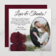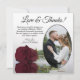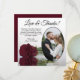 These beautiful wedding thank you cards are a wonderful way to show your appreciation to your friends and family for celebrating with you on your special day. They feature your wedding photo in an oval shaped frame with a single long stemmed burgundy, maroon, or wine-red coloured rose lying on its side reflecting in water. The title reads "Love & Thanks" with room for a custom note and signature. Classy, romantic, and sophisticated, these cards are the perfect way to conclude your wedding celebration.
