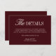 Provide guests with all the essential information in style with this elegant wedding details card. Featuring a deep burgundy background paired with refined serif and script typography, this insert is perfect for formal, vineyard, or evening weddings. Use it to share travel directions, hotel accommodations, RSVP instructions, or your wedding website link. Fully customisable. Coordinates with the matching “Sabrina” —follow the link on this page to view matching signage, menus, invitations, and more. • Mockups for this design were created using Midjourney AI.