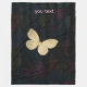 The image shows a woven blanket featuring a large golden butterfly at its centre on a dark textured background with subtle shades of purple and blue. The blanket has fringed edges and includes the customisable placeholder text “you text” in pink along the side.
