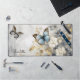 Elegant Butterfly Floral Personalised Name Desk Mat features blue butterflies with white, blue and gold flowers on an abstract background and personalised with your name in modern calligraphy script typography. Perfect as a gift for her and family and friends for birthday, Christmas, holidays, Mother's Day, sister, wife, partner, best friends, work colleagues and more. Designed by ©Evco Studio www.zazzle.com/store/evcostudio