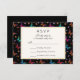 A wedding RSVP card with an elegant pattern with graphic illustrations of butterflies in many bright colours, contrasting very nicely on the black background. Whimsical