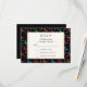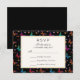 A wedding RSVP card with an elegant pattern with graphic illustrations of butterflies in many bright colours, contrasting very nicely on the black background. Whimsical