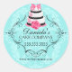 © 2013 Socialite Designs. Our couture cake bakery box seals / stickers have an elegant cake with flowers and swirls, and topped with a bow. The aqua background is a subtle damask design. Your business text goes inside an elegant scroll decoration.
