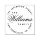 In the centre, the name is written in an elegant calligraphic script, with the word "family" in small caps under it. . It is surrounded by address, written in a circle, with caps, the street above, the city and state below.