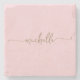 Elegant Chic Modern Gold Monogram Name Signature Script Custom Personalised Stone Coaster. This design featuring custom name in a cursive hand lettered swash tail font calligraphy (or typography) in gold on blush pink or baby pink colour background. These are easy to customise it. Great stylish feminine housewarming gift, wedding, also for birthday, bridal shower, sweet 16 birthday party, mother’s day and It’s for the girl who loves unique stylish things.