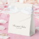 Minimalist personalized wedding favor boxes featuring elegant calligraphy names in black and ivory color design.