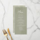 A simple minimalist wedding reception menu card template. This design features a wedding reception menu table card, a botanical tropical beach destination, a coastal island greenery foliage, with eat and drink dinner menu, a main course dessert salad soup, with green sage simple minimalist, a modern contemporary design style, a trendy stylish calligraphy script, a creative boho floral style, a custom monogram back side