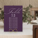 Purple wedding table seating card with elegant calligraphy and editable typography. Simple, modern minimalist design to suit your wedding colours. Table is lettered in handwritten script and the template is ready for you to edit the table number and your guest seating list.