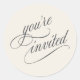 Add a special touch to your invitations or correspondence with this "you're invited" sticker featuring a lovely calligraphy type face. Shown here with a neutral beige background, you can change the background colour to match your event theme by choosing "customise" and selecting a different background colour.