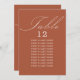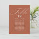 Terracotta wedding table seating card with elegant calligraphy and editable typography. Simple, modern minimalist design to suit your wedding colours. Table is lettered in handwritten script and the template is ready for you to edit the table number and your guest seating list.