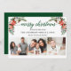 Modern Calligraphy Script. Elegant Winter Floral 3 Photo Merry Christmas Card includes beautiful watercolor red poinsettias, botanical greenery, winter foliage, holly berries, white roses, cotton, pine cones and blue berries. Green Back.
