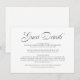Introducing our modern and stylish minimalist wedding guest details enclosure card. Designed with beautiful black calligraphy and classic lettering on a white background, this card is perfect for formal weddings. You have the option to change the colours of the text and background to match your theme. Don't let your guests miss a beat - add this elegant enclosure card to your wedding stationery suite today!