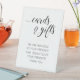 This beautiful wedding pedestal sign is a nice compliment to the table where cards and gifts are collected at the reception. The design features a combination of black handwritten and block fonts. This is part of the Alejandra collection.
