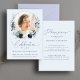 This is an elegant and modern funeral invitation card to celebrate the life of your loved one. The design features a beautiful calligraphy font and delicate floral wreath with blue, green and silvery botanicals that frame a photo. This invitation can easily be personalised with your own photo and text to create a special tribute for your loved one's funeral, memorial or celebration of life using the template provided.