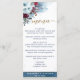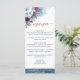 Delight your guests with this elegant Menu card that can have your name(s) and date on the bottom or let menu serve as place card and use this section to add guest name and last name. Set apart design featuring on the top a unique design with delicate blue watercolor stain cascading behind corner floral detail, as well as golden speckles, menu in golden hand written modern calligraphy and blue watercolor stripe on the bottom. Flowers and foliage in dusty blue, navy, burgundy, red, magenta and purple hues. Blue watercolor back. Part of our "Celestial Blooms" collection with a variety of coordinating products available.