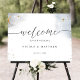 Welcome your guests with this elegant welcome sign with an exquisite watercolor sky, moon, and stars. Modern handwritten calligraphy details. Gold dainty stars as well as half moon in faux gold foil. Sky in a beautiful blend of silver, grey, white, and a touch of blue hues. 10" x 8" is simply our default size, you can choose from a great variety of size options. "IMPORTANT NOTE: This sign is in premium poster paper style, easy to frame or glue/staple to inexpensive MDF or foam board for display. If you are looking for a sign ready for display on a foam board, Zazzle does offer "foam board signs" and you can certainly transfer my design from the sign you liked into a foam board option. To do so, simply follow these easy steps: on the sign, product page scroll down, until you see a section with images called "Transfer design to a product". Use the arrow on the images to look at all the options, until you reach the "Foam Boards" option. Click on it, and it will transfer the design into a foam board for you. Sometimes it transfers it into a very big size, but you can choose the size you like and need right there on the product page and see how it looks. When you add this design to your shopping cart, it will tell you the back side is blank. Don't worry about it, as this only means that the back of the sign will be white". Part of our" White, Gold and Silver Celestial Stars and Moon" collection with a variety of coordinating products available. Visit the entire collection at: https://www.zazzle.com/collections/gold_white_and_silver_celestial_stars_and_moon-119446192561160871 Dimensions of sign in demo photo with stand: 24" x 18"