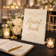 This elegant champagne gold wedding guest book sign invites guests to leave their heartfelt messages as they arrive at the celebration. The refined script typography and soft neutral background create a timeless look that blends beautifully with romantic reception décor, memory tables, and welcome areas. Designed for weddings, vow renewals, and milestone anniversaries, this pedestal display helps guide guests while adding a graceful decorative touch to the signing table. The champagne gold lettering and soft ivory background pair beautifully with classic ballroom receptions, garden weddings, and sophisticated anniversary celebrations.
