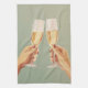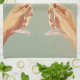 Two hands holding champagne flutes in a celebratory toast against a soft pastel background. The scene captures an elegant and joyful New Year’s Eve moment with golden bubbles rising in the glasses.