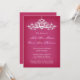 Elegant wedding invitation design with a highly detailed silver chandelier on a pink background. This design comes on several stationery products to make a beautiful theme for all your wedding stationery.
