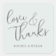This elegant wedding sticker features a minimalist design with flowing cursive typography that reads "love & Thanks" in a sophisticated dark hue against a light grey background. The layout is clean and uncluttered, emphasizing the heartfelt message with ample negative space around the text. Below, customisable names can be added in a simple sans-serif font, making it perfect for personalising your special day. The overall style is romantic and intimate, ideal for expressing gratitude and affection at weddings or other celebrations.