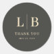 This Classic Round Sticker features a sophisticated and minimalist design with a deep charcoal gray background. The layout includes elegant serif typography in metallic gold, showcasing the initials "L | B" prominently at the center, followed by the words "THANK YOU." The ample negative space enhances the refined aesthetic, making it perfect for expressing gratitude in a stylish manner. Ideal for formal events or as a token of appreciation, this sticker combines timeless elegance with a modern touch.