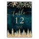 his stunning Christmas winter table number card features a rich teal background, glittering gold snowflakes, and a festive pine tree design. Perfect for winter weddings, holiday parties, or elegant Christmas celebrations, it adds a touch of sophistication and warmth to your table settings.