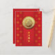 Golden Dragon paper-cut into a golden circle with "Year of the Dragon" + "Happy Chinese New Year" in English and Chinese (calligraphy) on a decorated red pattern background. Design on vertical postcard. Perfect for Chinese New Year of the Dragon 2024.