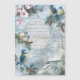 Elegant rustic floral design featuring vintage bluebirds perched on holly and pine boughs, white dog roses, quaint farm with water wheel, handwriting, scrolls and white flourishes with "Home Sweet Home" music in ornately engraved frame. Background features pale blue sky with white clouds.