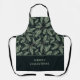 This stylish holiday apron features multiple Christmas pine branches in various shades of green, on a dark black background. The text as shown says "Merry Christmas", but you can change the text to anything you would like, including your family name or monogram.
