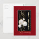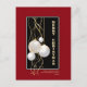 A sophisticated Merry Christmas postcard featuring white and gold hanging ribbons and ornaments on a black and red background for you to share the joy of the festive season. Customize your details in the information provided below the image.