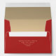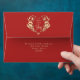 Modern, elegant, stylish, chic red Christmas envelope, with gold heart shape wreath, holiday wishes and return address. Peace, Love, Joy!