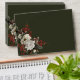Chic, dark green, with elegant florals and red berries. Lighter wide space on the front for handwritten recipient address. Classic family name and return address text on the back flap. Script typography "Merry Christmas" greeting on the lower back. Customise by adding your own family name and return address (back).
