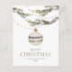 This elegant Christmas card features a minimalist design with a single silver ornament hanging under greenery. The delicate branches and muted tones give it a sophisticated, festive feel. "Merry Christmas" is printed in stylish lettering, creating a warm and welcoming holiday greeting.