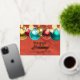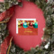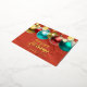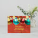 This is a customisable business holiday postcard that exudes warmth and festive cheer. The card features a rich, red background with a golden texture, giving it a luxurious feel. Adorned with a string of beautifully designed Christmas ornaments in gold, red, blue, and green, it captures the essence of the holiday season. The front of the card carries a heartfelt message of "Happy Holidays" in a combination of sans serif and an elegant gold cursive font. Below it, you can personalise the card with your company's name. The real foil accents add a touch of sophistication and shine, making this card truly stand out. This postcard is not just a greeting, it's a memorable keepsake.