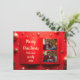 Elegant Christmas photo card design featuring a vibrant red background with golden ornaments, festive pine branches, and a centred photo frame on an open-book style layout. Customisable with your family name and year, this holiday greeting card is perfect for sending warm Merry Christmas wishes to friends and loved ones. A beautiful blend of modern minimalism and timeless Christmas charm.