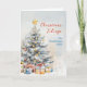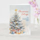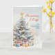 An elegant Christmas tree graces this lovely folded holiday card. Pretty gold baubles highlight the snowy pine and a bright star is the topper on this vintage watercolor design. Gifts and packages in pretty matching colours are all around the base of the tree. The greeting on the front of the card is "Christmas Tidings", but you can change that to another seasonal greeting of your choice, if you prefer. On the inside, also in red and blue typography, are example sentiments of good tidings and "from" names. Be sure to change these to your choices, as well as the family name and date on the front.