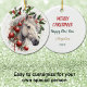 This pretty Holiday ornament is perfect for a daughter, granddaughter, or niece who loves horses! The front features a stunning image of a white stallion. The horse is wearing red Christmas decorations, and is in front of holly and red berry sprigs. Everything is placed on a white background that is sprinkled with gold confetti. The back of the ornament is white, with four text fields in red, green, and gold for your customisation.