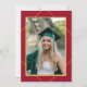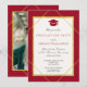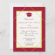 Classy formal elegant style red and white graduation party invitation with a gold geometric frame and grad hat.