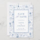 This elegant timeless coastal wedding save the date card with a photo on the back features a seaside toile de jouy pattern of hand drawn lighthouses, sailboats, and ocean waves, reminiscent of summer on the New England coast.