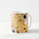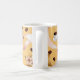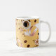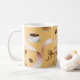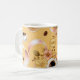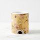 This coffee mug features a warm yellow background adorned with delicate floral designs, accented by scattered coffee beans and soft pink ribbon elements. The central focus of the design is a customisable monogram, framed in an elegant gold border, adding a touch of personalisation and sophistication. The artwork also includes steaming coffee cups nestled among the flowers and ribbons, enhancing the cosy and inviting theme. This mug is perfect for coffee enthusiasts who appreciate a stylish and customisable design.