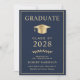 Elegant dark blue college graduation announcement and party invitation featuring a gold graduation cap and simple modern gold typography for the graduate's name, class year, college or university, degree and major or honors. On the reverse side, add the graduation details.