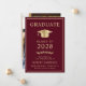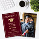 Elegant burgundy red college graduation announcement featuring a gold grad cap and simple light gold modern typography for the graduate's name, class year, college or university, degree and major or honours. The graduate's photo fills the back of the card.