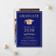 Elegant navy blue college graduation announcement featuring a gold grad cap and light gold modern typography for the graduate's name, class year, college or university, degree and major or honours. The graduate's photo fills the back of the card.