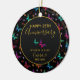 A commemorative ornament for an anniversary. Designed with an elegant pattern with a graphic illustration of fluttering butterflies in many bright colours, contrasting very nicely on the black background. Whimsical florals, sprigs and leaves add a bit of charm. A black round frame with a gold coloured border layered over top with your personalised text inside.