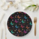 paper plates designed with an elegant pattern with a graphic illustration of fluttering butterflies in many bright colours, contrasting very nicely on the black background. Whimsical florals, sprigs and leaves add a bit of charm.