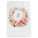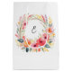 This pretty gift bag pictures summer flowers in a watercolor style, in a circular wreath arrangement. Personalise the bag with the recipient's initial, which will form a monogram in an elegant script font. The floral bag is ideal for presenting a gift to a garden lover for their birthday or another special occasion.